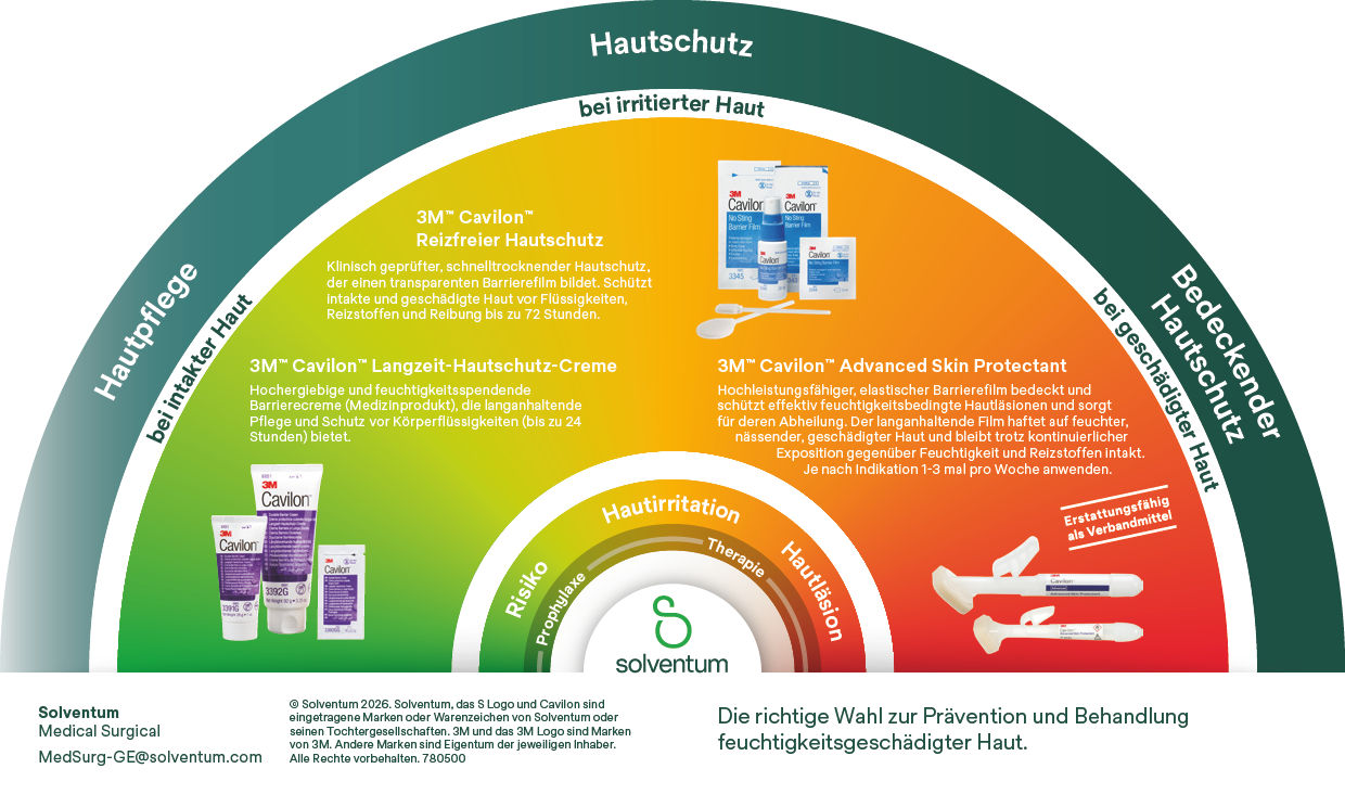Schützen und pflegen Sie gefährdete oder beeinträchtigte Haut mit unseren innovativen Lösungen, die sorgfältig entwickelt wurden, um die Hautgesundheit zu priorisieren. Machen Sie sich mit unserer 3M™ Cavilon™ Produktfamilie vertraut, um unter Anderem MASD, MARSI und Druckgeschwüren vorzubeugen und sie zu behandeln.