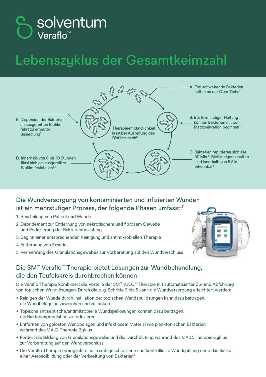 Die Veraflo Therapie kann Teil des Behandlungsplans für infizierte Wunden sein, in Verbindung mit guter klinischer Praxis wie Débridement und Antibiotikatherapie. Die Veraflo Therapie ermöglicht das Einbringen von topischen Wundspüllösungen, die helfen können, die bakterielle Population durch wiederholte Reinigungsvorgänge zu kontrollieren und somit den Keimbelastungszyklus zu unterbrechen. Eine Reduktion der bakteriellen Keimbelastung durch den Einsatz der Veraflo Therapie fördert den Wundheilungsprozess.2,3