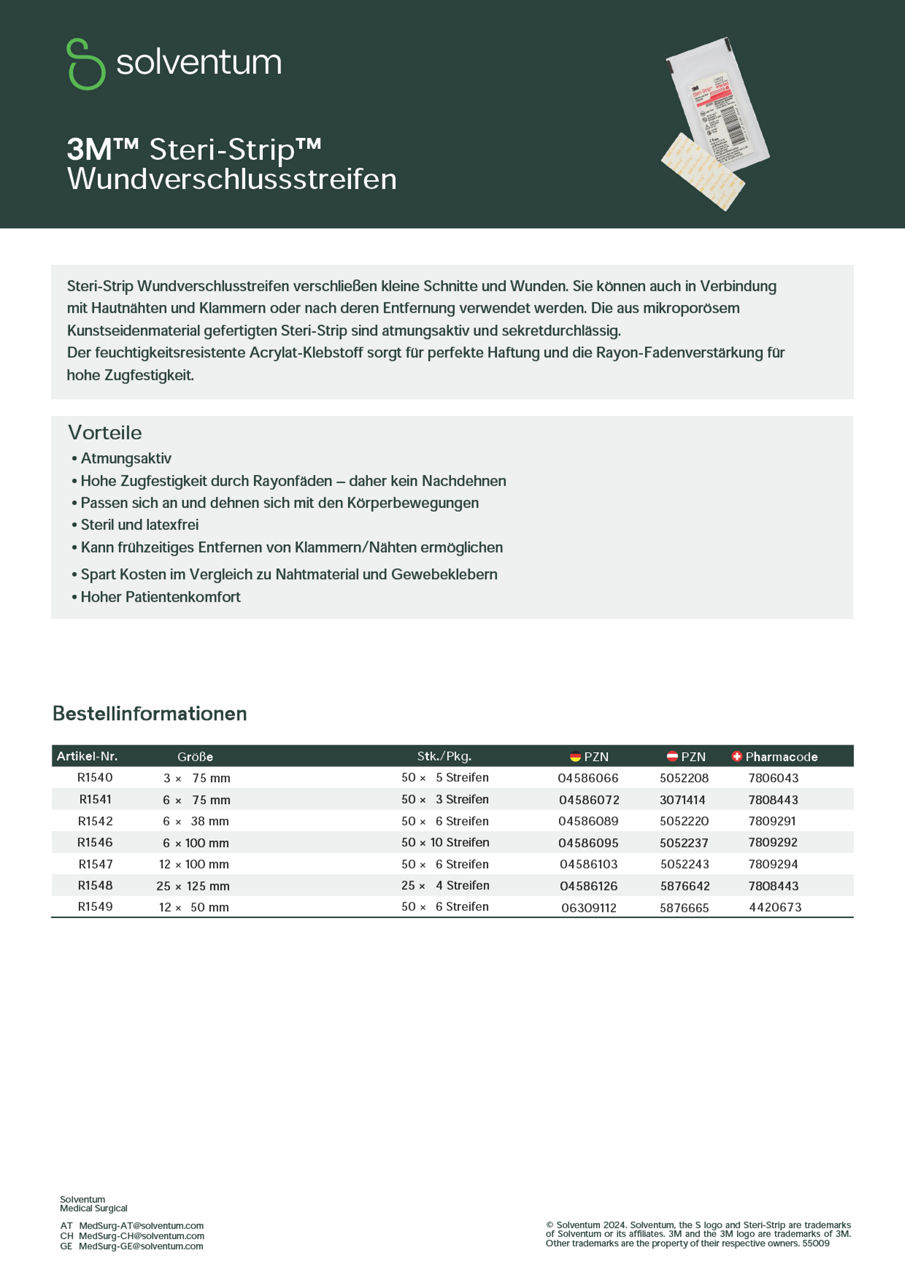 Bitte beachten Sie die Gebrauchsanweisung, einschließlich Warnhinweise, Vorsichtsmaßnahmen und andere wichtige Informationen zur Verwendung von Steri-Strip Wundverschlussstreifen.