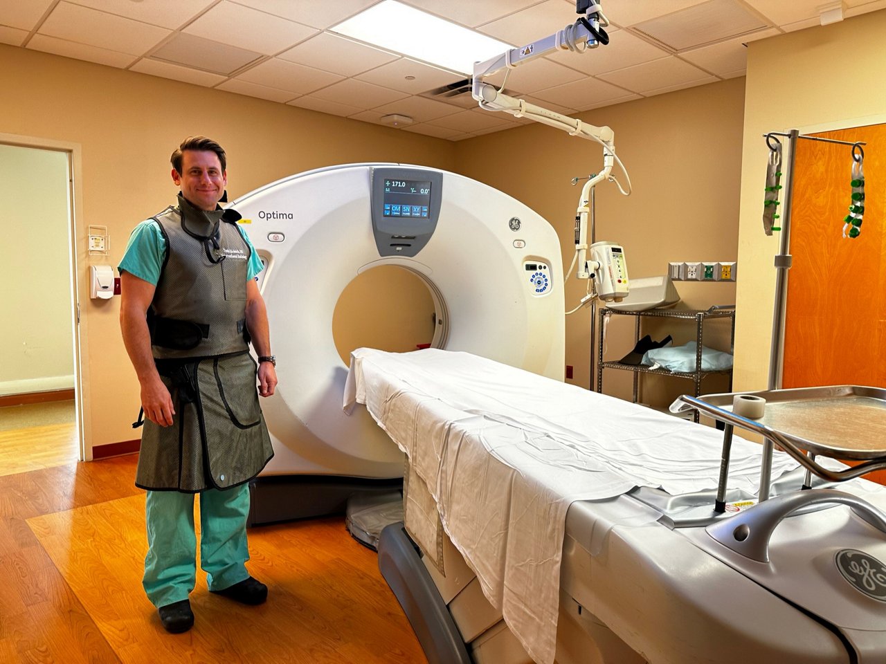 Dr. Edelstein prepares for a computed tomography (CT) exam.