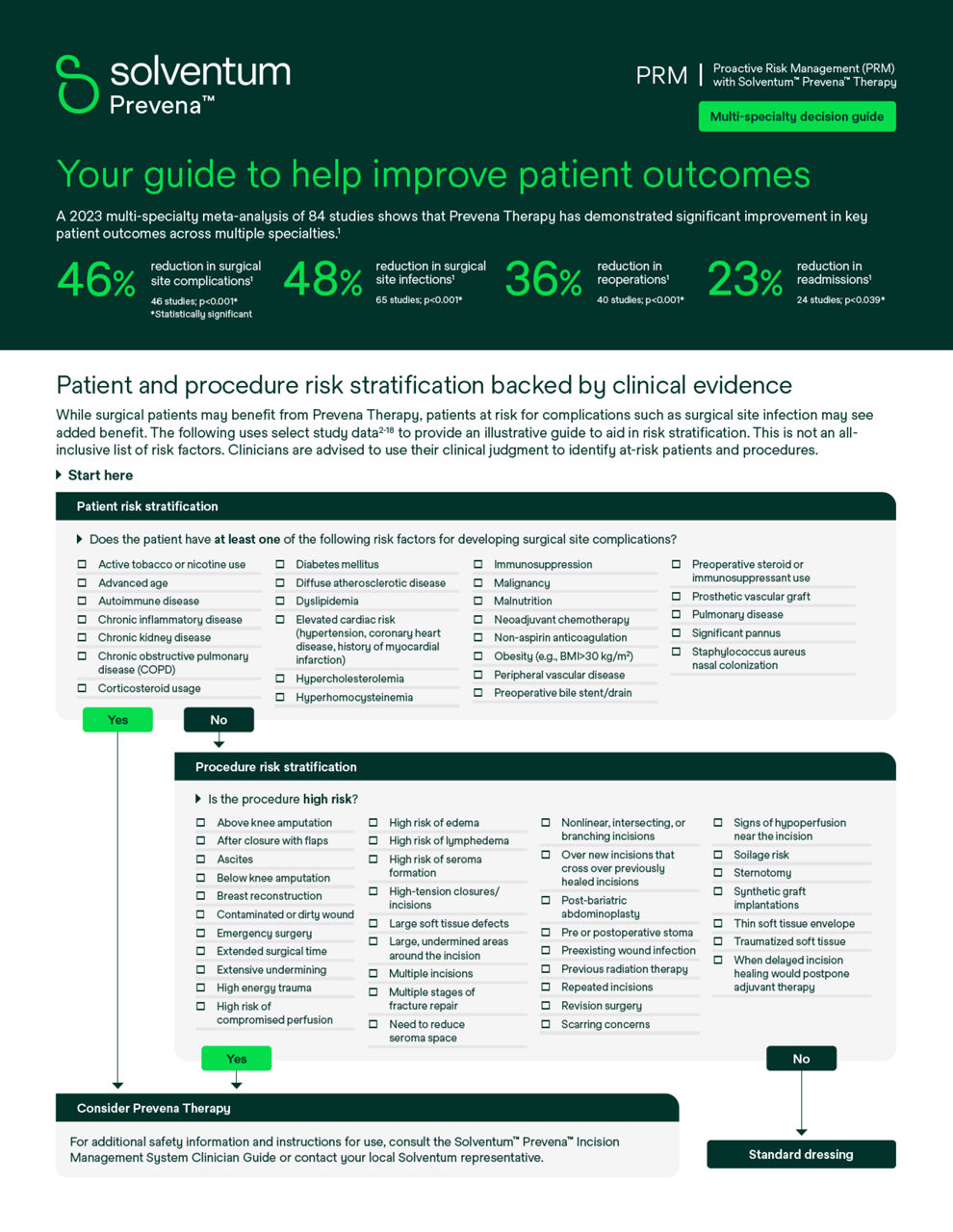 In today's healthcare landscape, where complex surgeries and patient comorbidities are prevalent, effective postoperative care is crucial to reduce extended hospital stays, readmissions and to improve overall patient outcomes. The Prevena Incision Management System is designed to proactively manage the environment of closed surgical incisions, such as superficial surgical site infections in Class I and Class II wounds* in patients at high risk for postoperative infections and incidence of seroma by maintaining a sealed environment with negative pressure therapy. This closed-incision negative pressure therapy (ciNPT) system provides: