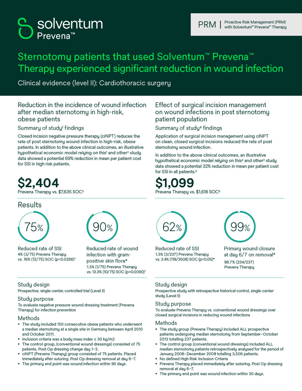 A peer-reviewed meta-analysis of 6 studies for cardiac surgical procedures demonstrated Solventum™ Prevena™ Therapy helped significantly reduce the risk of surgical site infections (SSIs) compared to standard-of-care dressings.¹