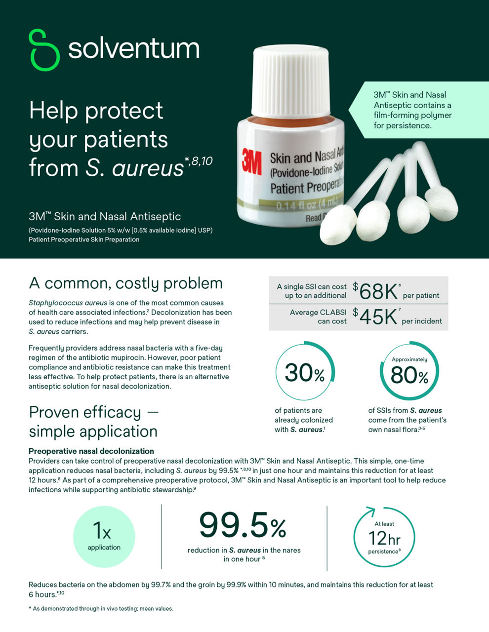 Designed to help address the rising concern of SSIs that can be caused by bacteria in the nares, this solution is a key element of patient preoperative skin preparation. By reducing the risk factors that contribute to SSIs, you can make a significant impact on patient outcomes. Using Skin and Nasal Antiseptic before surgery and in the ICU helps reduce bacterial load, including Staphylococcus aureus, which is the leading cause of SSIs among adult and pediatric patients. By aligning with CDC, SHEA, IDSA, APIC and other leading organizations, you can help prevent SSIs.