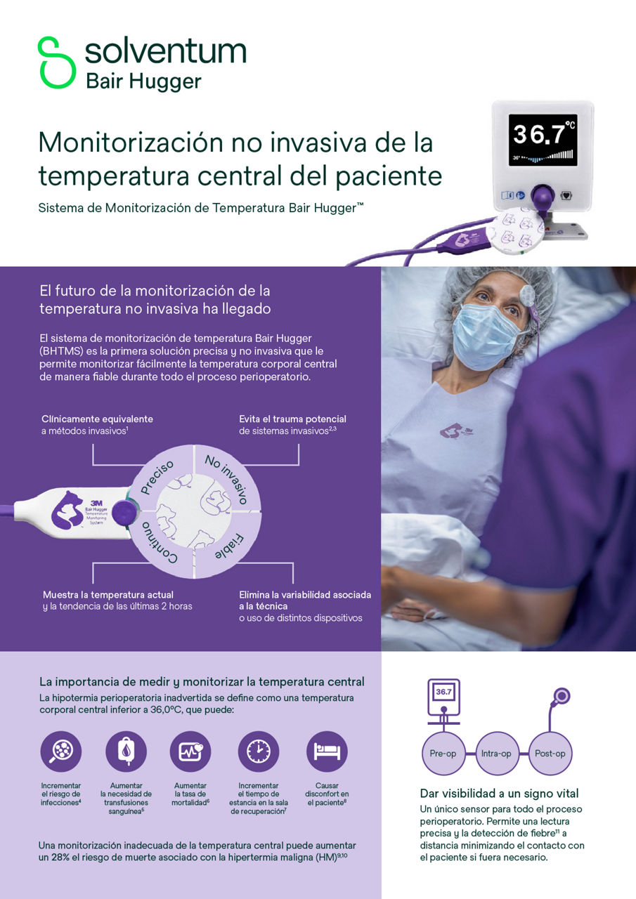 Monitoree la temperatura central del cuerpo de sus pacientes durante la cirugía con el sistema de monitorización de la temperatura 3Mᵀᴹ Bair Huggerᵀᴹ. Ayude proactivamente a lograr y mantener la normotermia con el sistema de calentamiento 3Mᵀᴹ Bair Huggerᵀᴹ.