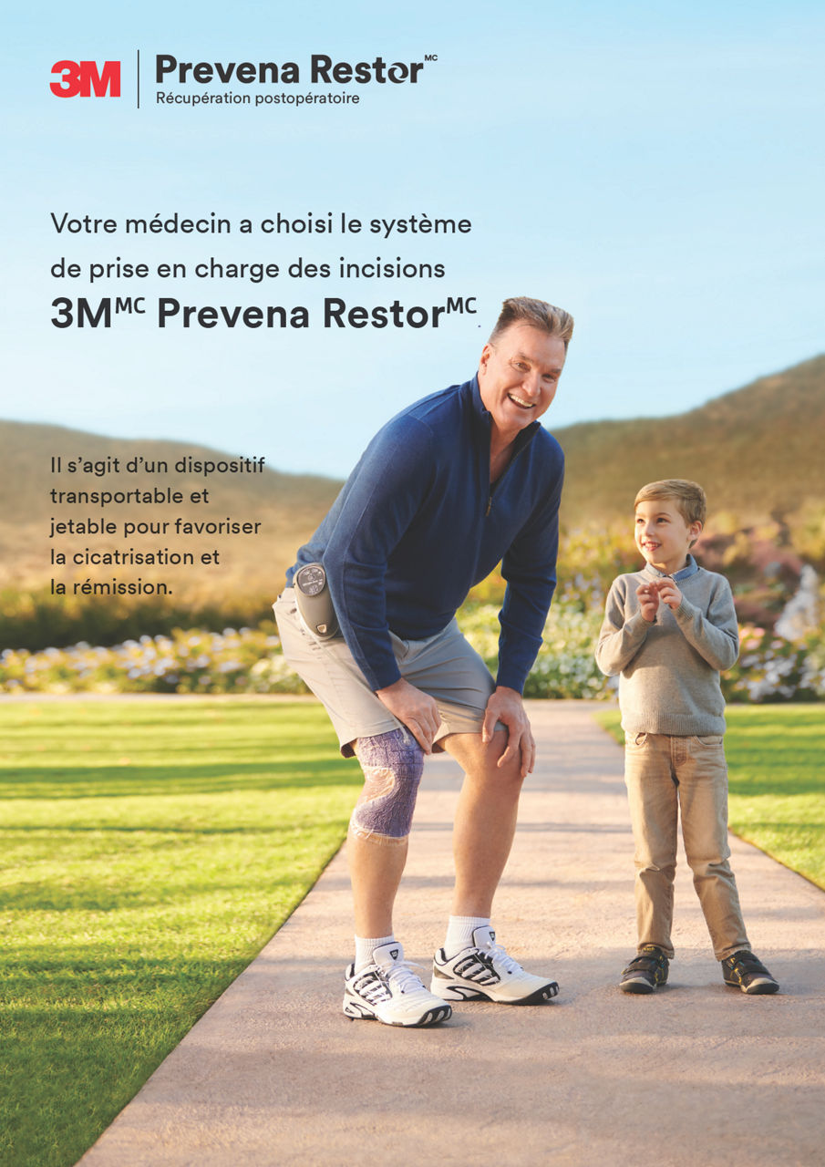 - Veuillez consulter la section intitulée « Résumé des informations cliniques » des directives d’utilisation pour connaître quelles procédures chirurgicales et quels patients précis ont été inclus dans les études cliniques. Les chirurgiens doivent continuer de suivre les renseignements contenus dans les documents « Centers for Disease Control and Prevention Guideline for the Prevention of Surgical Site Infection » et « American College of Surgeons and Surgical Infection Society: Surgical Site Infection Guidelines3» afin de respecter les pratiques exemplaires dans la prévention des infections du site opératoire. Approuvé par la FDA américaine : Pansements/Systèmes (Pansements Prevena utilisés avec les unités Solventum TPN compatibles — ActiVAC, Ulta et RX4) et pays en dehors des États-Unis applicables qui s’appuient sur l’indication américaine : Les Systèmes de gestion des incisions PREVENA™, PREVENA PLUS™, PREVENA DUO™, and PREVENA RESTOR™ sont destinés à gérer l’environnement des incisions chirurgicales à drainage continu la suite d’une fermeture par suture ou agrafage, en maintenant un environnement fermé et en évacuant l’exsudat par l’application d’une thérapie par pression négative.