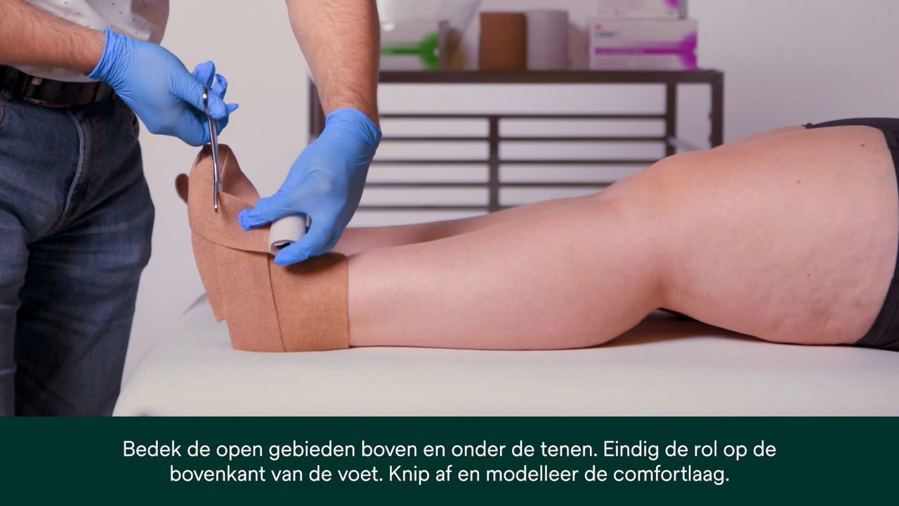 - De dunne, lichtgewicht en luchtdoorlatende zwachtel maakt het voor patiënten mogelijk om hun eigen schoeisel te dragen⁴, zodat ze hun normale dagelijkse activiteiten weer kunnen hervatten.